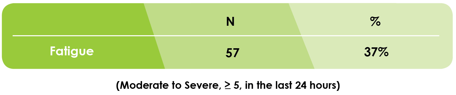 We also asked them to rate their fatigue on a scale from 0-10 in the last 24 hours with ‘0’ indicating no fatigue and ‘10’ indicated the worst fatigue they can imagine. Over 30% reported that the fatigue was moderate to severe in the last 24 hours, a rating that has been shown to affect daily activities and quality of life.