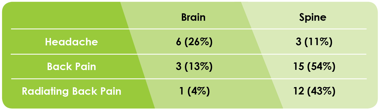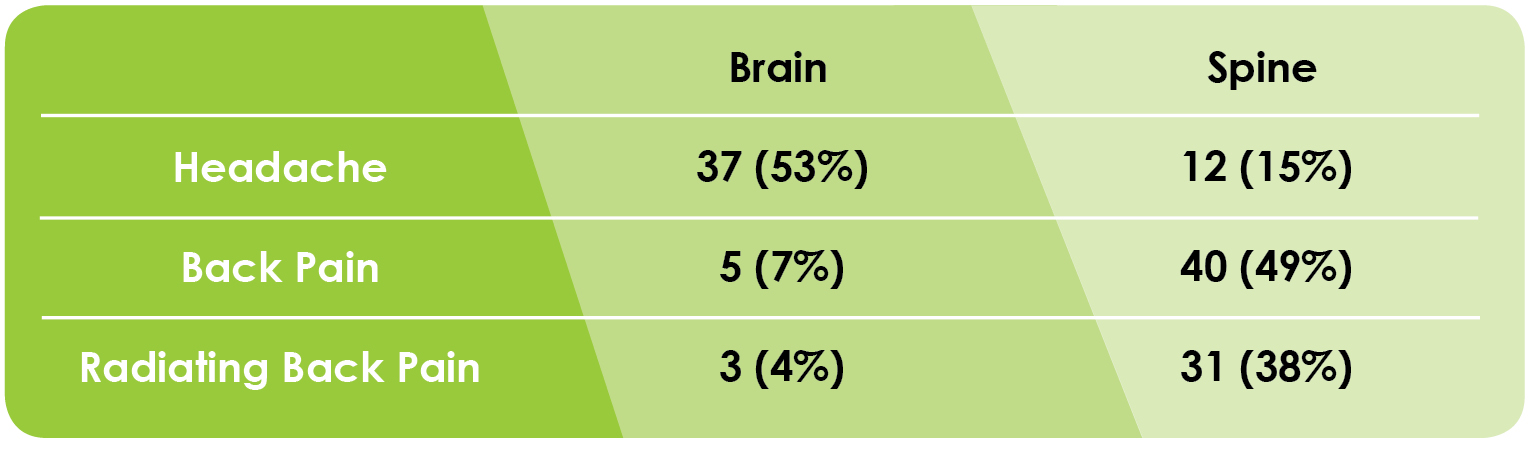 One question we asked was whether the person complained of pain at the first surgery. Over 50% of those with brain tumors had headache, and over 49% with spine tumors had back pain.