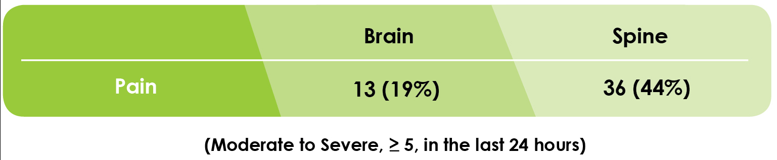 We also asked if pain occurred when the tumor recurred, and ¼ of those with brain tumors had pain, but the majority (83%) of those with spine tumors had pain.
