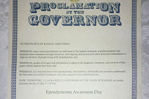 (Kansas) Kansas recognized May 5, 2019 as Ependymoma Awareness Day by issuing a proclamation. Chris submitted the request in honor of his daughter, Allie, who was diagnosed with a grade III anaplastic ependymoma in 2016 at the age of 24. They have a unique bond. Both having brain surgeries, he was able to guide her through surgery and continues to support her through treatments.