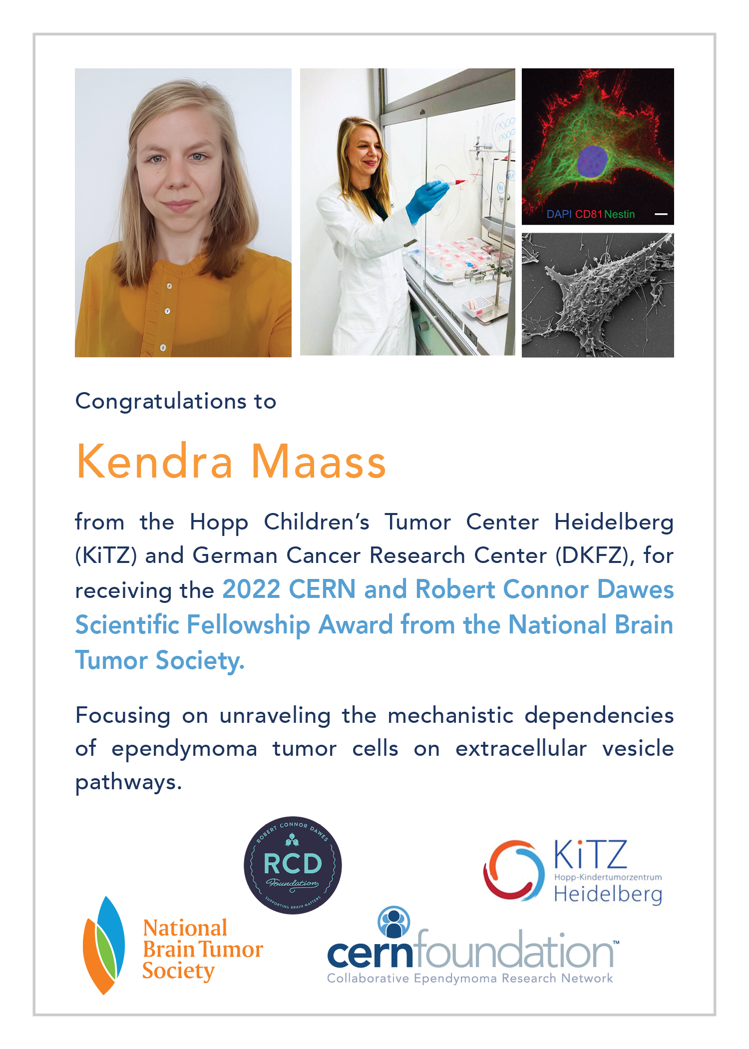 Kendra Maass, from the Hopp Children's Tumor Center Heidelberg (KiTZ) and German Cancer Research Center (DFKZ), is the recipient of the 2022 CERN and Robert Connor Dawes Scientific Fellowship awarded by the National Brain Tumor Society. Research efforts will focus on unraveling the mechanistic dependencies of ependymoma tumor cells on extracellular vesicle pathways.