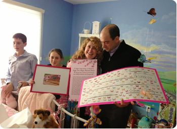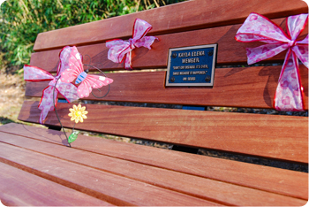 They decided to collect donations for a park bench dedicated in Kayla’s name. With the help of a giving website, they received more than 70 generous donations, which paid for the bench with enough left over to fund a $3,000 contribution to CERN Foundation’s 2013 Ependymoma Awareness Day. With many tears, Kayla’s aunts, Debbie and Julie, ushered her parents, Eric and Laurie Wenger, into a room full of family members and close friends, where they surprised them with the CERN donation check and a photo of the new bench decorated with pink ribbons and butterflies.